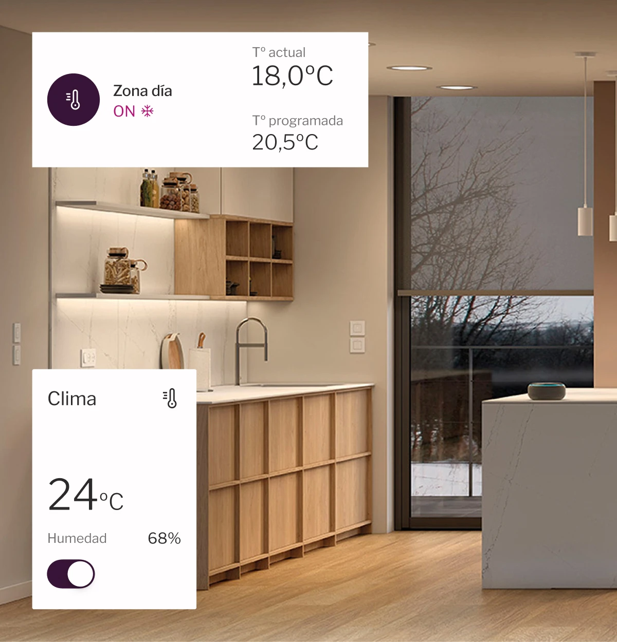 Crea ambientes en un segundo unificando luz, clima y dispositivos según el uso del espacio.